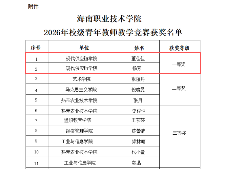 图1 海南职业技术学院2026年校级青年教师教学竞赛获奖名单